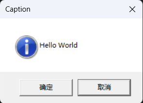 int nRet=MessageBox(NULL, TEXT("Hello World"), TEXT("Caption"), MB_OKCANCEL | MB_ICONINFORMATION | MB_DEFBUTTON2);
