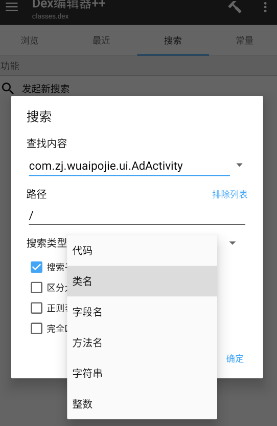 我们回到安装包中的.dex文件中搜索这个类名