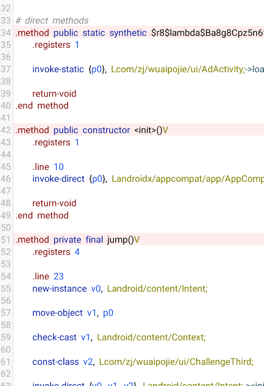 我们可以看见最下面一行这个方法调用了AdActivity,定位到其所在的smali,再将其转为java代码
