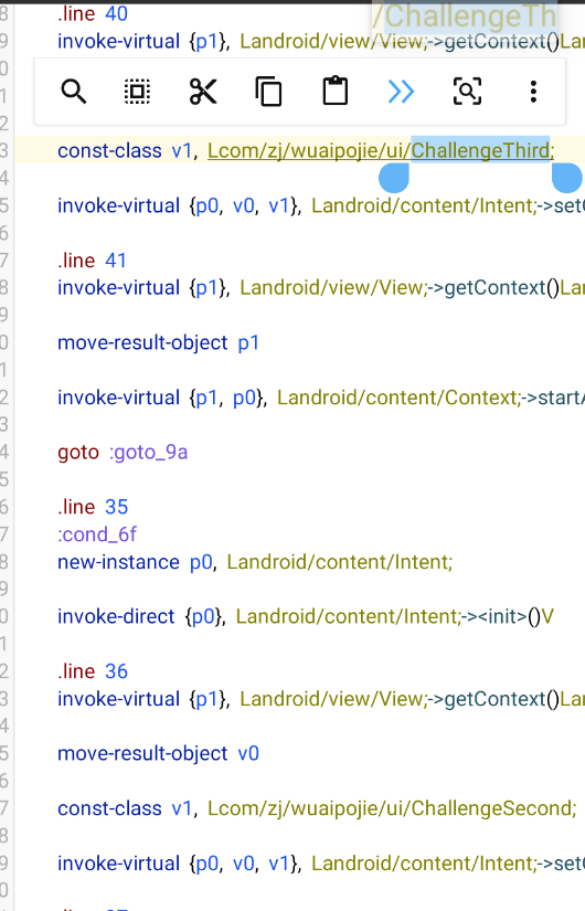 可以看见堆栈相关的调用,我们复制onCreate方法com.zj.wuaipojie.ui.ChallengeThird.onCreate去dex中搜索